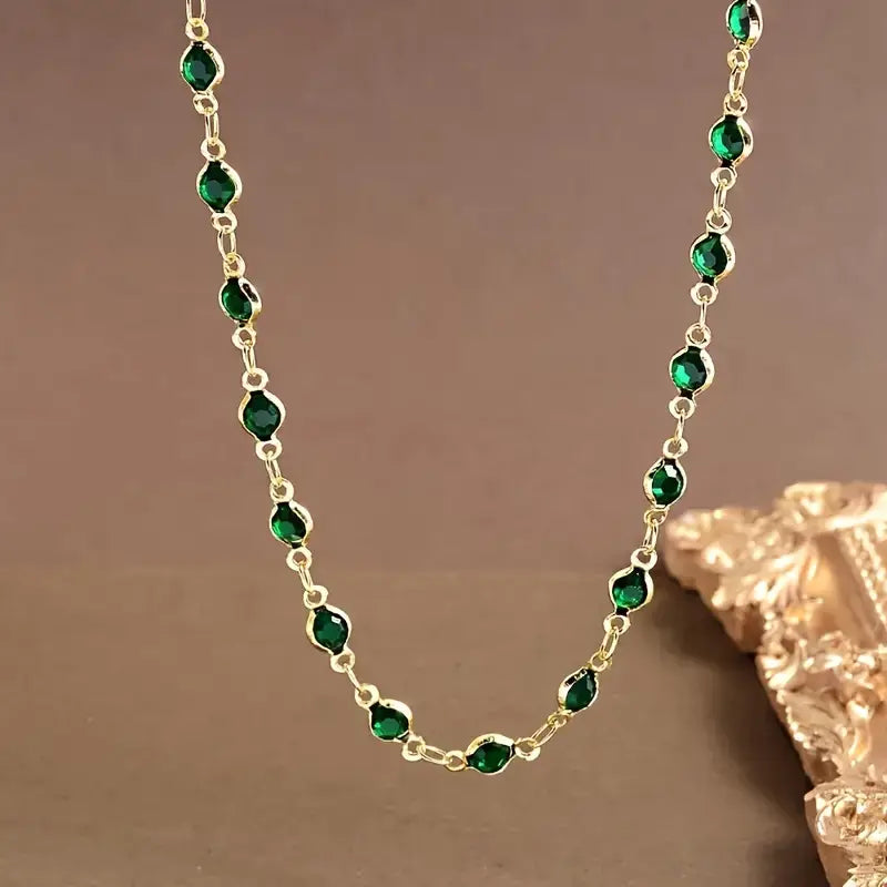Lanțul fin și pietrele verzi atent montate creează un efect de rafinament discret potrivit atât pentru zi cât și pentru seară.